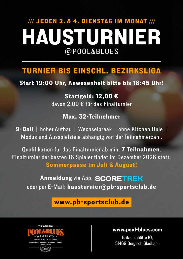 Jeden 2. & 4. Dienstag findet im Pool&Blues ein Poolbillard-Hausturnier statt. Alle weiteren Infos entnehmt ihr dem Plakat.