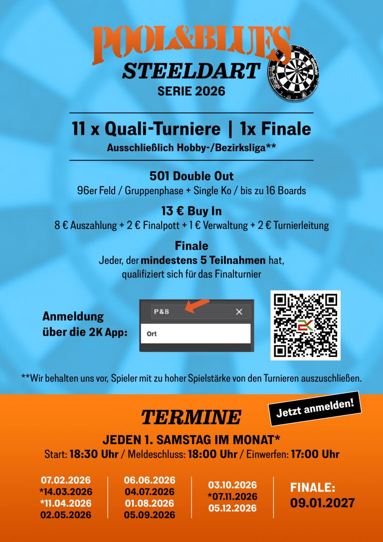Jeden 1. Samstag im Monat findet unsere Steeldart Serie statt. Alle Termine und weitere Infos findet ihr auf dem Plakat.
